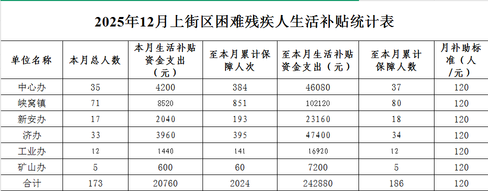 2025年12月上街区困难残疾人生活补贴统计表